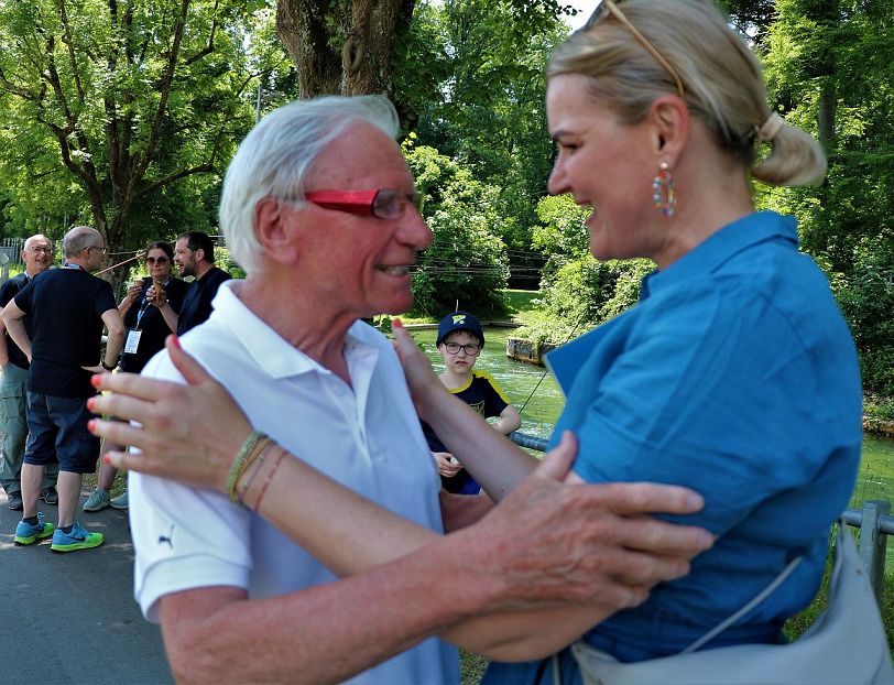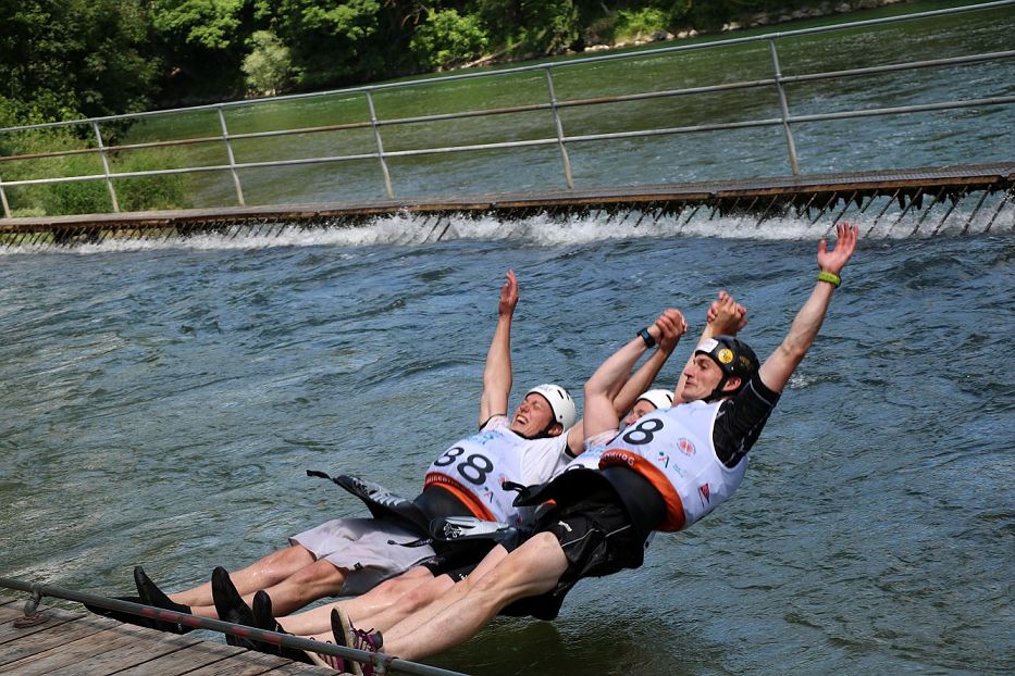 Bild: K-H Englet, Eva WeberDas Publikum freute sich, ihre Oberbürgermeisterin so hautnah zu erleben, aber allzu lange konnte sie nicht bleiben, denn nach ihrem Urlaub standen weitere Termine auf ihrem Zeitplan. Unsere K 1 Damen Starterin Sabine Füsser war glücklich über ihre Fahrzeit von 68,91 Sekunden (Start an der Brücke beim ehemaligen Wettkampfturm bis hinunter ins Ziel) die anderen Starterinnen könnten ihre Töchter sein und sie als 48-Jährige belegte den 5. Platz im stark besetzten WM Finale. Wie ging es unseren Kanu Schwaben Wildwasser Sprintsportlerinnen und Sportlern? Sabrina Barm war dies noch nie passiert, hinter der Bogenbrücke einen Dreher zu bekommen, aber bei der Sprint WM ist dies geschehen, dadurch verpasste sie den Sprung in das WM Finale bei den C 1 Damen. Aber es blieb ja noch das Canadier Zweier Team - Sabrina Barm mit ihrer Teamkollegin Constanze Feine fuhren mit 73,87 Sekunden den Olympiakanal hinunter, 1,88 Sekunden trennten sie von den Erstplatzierten, aber es wurde am Ende der vierte Platz, schade, so knapp schrammten sie an der Bronzemedaille vorbei, aber das C 2 Herren Boot mit Normen Weber und Tim Heilinger waren nur 1,50 Sekunden vom Erstplatzierten entfernt und fuhren sich mit diesem Abstand auf den fünften Platz. Ganz schön eng geht es auch in dieser Sportart zu. Bild: Deutsches K-Team im Glück In den Teamwettbewerben holte Normen Weber mit Tim Heilinger und Ole Schwarz dafür die Goldmedaille, die deutschen K 1 Herren fuhren sich auf Platz zwei und holten Silber. Bild: Temwettbewerb Ein versöhnlicher Abschluss und nach den Siegerehrungen wurde die ICF Wildwasser Weltmeisterschaft offiziell durch Chair Manuela Gawehn für beendet erklärt und die ICF Bild: Normen Weber