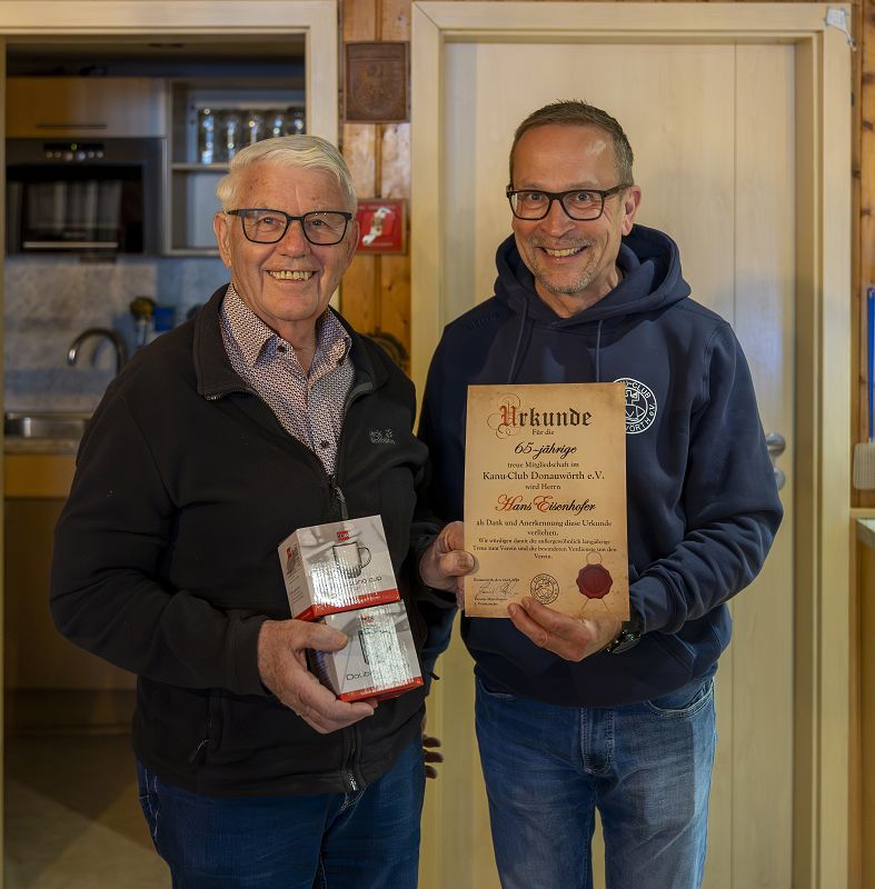 Rückblick auf ein ereignisreiches VereinsjahrAm 14. März 2026 fand die diesjährige Jahreshauptversammlung des Kanu-Clubs Donauwörth im gut besuchten Vereinsheim statt. Der 1. Vorsitzende Thomas Mayerhauser führte in seinem kurzweiligen Jahresbericht durch ein ereignisreiches Vereinsjahr. Besonders geprägt war dieses von zahlreichen sportlichen Aktivitäten und gemeinsamen Unternehmungen. Dazu zählten unter anderem Paddeltouren am Plansee, auf dem Lech sowie im Spreewald, die bei den Mitgliedern großen Anklang fanden und das Vereinsleben bereicherten.Bild v.l.: Hans Eisenhofer, Thomas Mayerhauser
