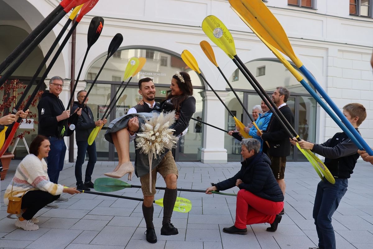 Sideris HochzeitDenise Sattich und Sideris Tasiadis haben heute am 23.10.2021 im Wittelsbacher Schloss in Friedberg (Bayern) geheiratet. Dem Bürgermeister Roland Eichmann war es eine Ehre, die beiden standesamtlich zu trauen. Alles war perfekt vorbereitet und zur Überraschung des frischgebackenen Ehepaar's, warteten nach der Trauung die Vereinskameraden von Sideris Tasiadis mit einem Paddelspalier im Schlosshof und Sidi musste seine frisch angetraute Denise über einige Paddel hinüber tragen. Der Bronzemedaillengewinner von Tokio 2021 wohnt in Friedberg-West und hat mit seiner Trauung im Wittelsbacher Schloss und dem anschließenden Sektempfang einen tollen Start in die Ehe vorgelegt. Die Kanu Schwaben gratulieren recht herzlich und wünschten ihm noch eine weitere tolle Feier im Kreise der Familie und seiner Freunde! Marianne Stenglein, Referentin für Presse, 23.10.2021  |