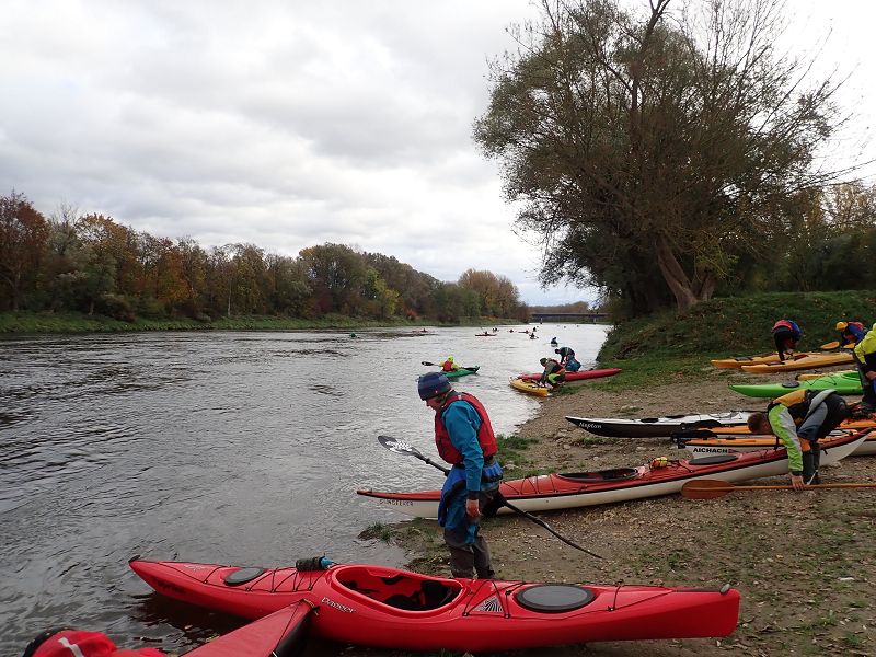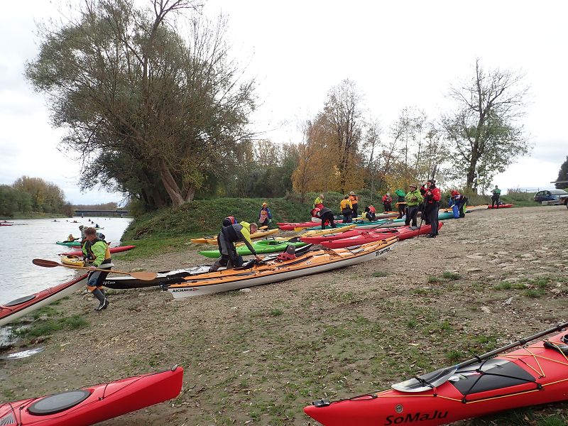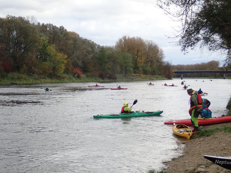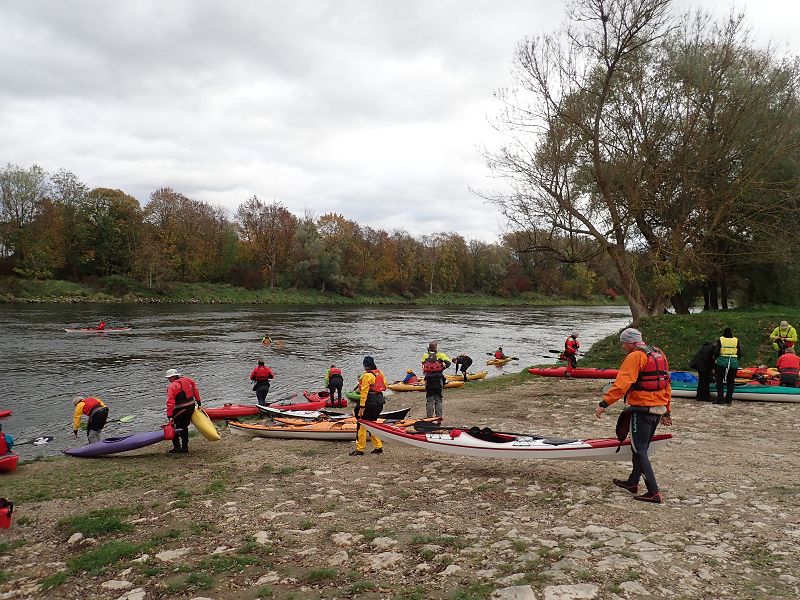Kilometer lang ist dieseDurch die späte Laubfärbung in diesem Jahr fuhren die Paddler mit vielen Kajaks und nur wenigen Canadiern durch eine bunte Landschaft. Wie immer war die Fahrt auf der Homepage des Bezirks Schwaben ausgeschrieben und dabei war eine detaillierte Beschreibung als PDF hinzugefügt worden. Wie im Vorjahr war die Anmeldung nur elektronisch über die HP nur als Einzelanmeldung möglich. Anmeldezeitraum war vom 01.10.2023 bis 02.11.2023. Bis 04.11.2023 hatten sich 86 PaddlerInnen angemeldet. Aufgrund gesundheitlicher Einschränkungen meldeten sich kurzfristig (Woche vor ABF) etwa 10 Personen ab. Neu war diesmal das Abmeldeverhalten aufgrund der Wetterprognosen, die starke Winde im Laufe des Sonntags bei Böen bis 70 km/h voraussagten. Hier sagten etwa 15 Personen ab. So starteten 58 Paddelnde, davon 25 Frauen. Der Bezirkswanderwart beobachtete seit Beginn der Woche die Wetterentwicklung. Als ab etwa Freitagabend die Prognose starken Wind aus SW und teilweise Sturmböen ankündigte und diese Aussagen sich zum Samstagabend verdichteten, grübelte ich, ob ich die Fahrt nicht hätte absagen müssen. Doch gerade mit der Windrichtung war eher eine Unterstützung für die Paddler gegeben und was die Böen anging, mussten wir sehen wie es tatsächlich sein würde. Notfalls musste die Fahrt vor dem Start offiziell abgesagt werden. Wichtig war vor die Winde zu kommen und zu bleiben und deshalb sofort nach dem Eintreffen der Busnutzer zu starten und möglichst Durchzupaddeln. Bezirkswanderwart Stefan Andreas Schmidt begrüßte alle mit einer kurzen Ansprache wies auf die Wetterentwicklung hin und bat nicht zu dicht unter dem Ufer (Bruchgefahr bei Bäumen) zu fahren und beieinander zu bleiben, um ggf. bei einer Kenterung Hilfe zu geben. Wind und die Wassertemperatur sind im November nicht zu unterschätzen. Nachdem im vergangenen Jahr der Vorstand der Bayerischen Einzelpaddler Dr. Stefan Schmidt einen neuen Pokal versprochen hatte, stand nun ein glänzender Wanderpokal zur Verfügung. Der durch die Einzelpaddler gestifteten Wanderpokal wurde, wie im Vorjahr zwischen den teilnehmenden und am Start befindlichen Vereinen ausgelost. Gewinner war die Kanuabteilung des Regenburgers Rudervereins. Der alte gläserne Wanderpokal wird zur Sammlung des Vereins Bayerische Kanugeschichte gegeben. Die Fahrt selbst verlief ohne jegliche Vorfälle. Ein starker Rückenwind, teils mit Böen begleitete alle. Kritischste Stelle war der Felsdurchbruch der Donau hinter Weltenburg. Hier kam es zu Düseneffekten und sich überlagernde Windströmungen. Zudem waren noch die Fahrgastschiffe von Kelheim nach Weltenburg unterwegs. Die Rückmeldungen der Teilnehmer waren ausnahmslos positiv, allen hat es gefallen und stolz darauf, auch bei diesen Wetterbedingungen sicher nach Kelheim gekommen zu sein. Den meisten Teilnehmern gelang es bevor die dunklen Wolken ihre nasse Fracht entluden in Kelheim anzulanden. Im Kelheimer Cafe „Donautor“ fand die Fahrt ihren gemütlichen Ausklang. Richtig nass; das wurden wir erst auf dem Rückweg vom Cafe zum Auto. Nach der Fahrt ist vor der Fahrt – und die nächste 37. Agnes-Bernauer-Fahrt findet am 10.11.2024 statt. Dann wünschen sich die Veranstalter neben einem guten Wetter und einer regen Teilnahme, eine stärkere Inanspruchnahme des angebotenen Pendelbusses. Ein hoher Fahrpreis will der Bezirk Schwaben vermeiden – der Bus sollte aber kostendeckend fahren und das ist nur möglich wenn mindestens etwa 50 Fahrgäste transportiert werden. Stefan Andreas